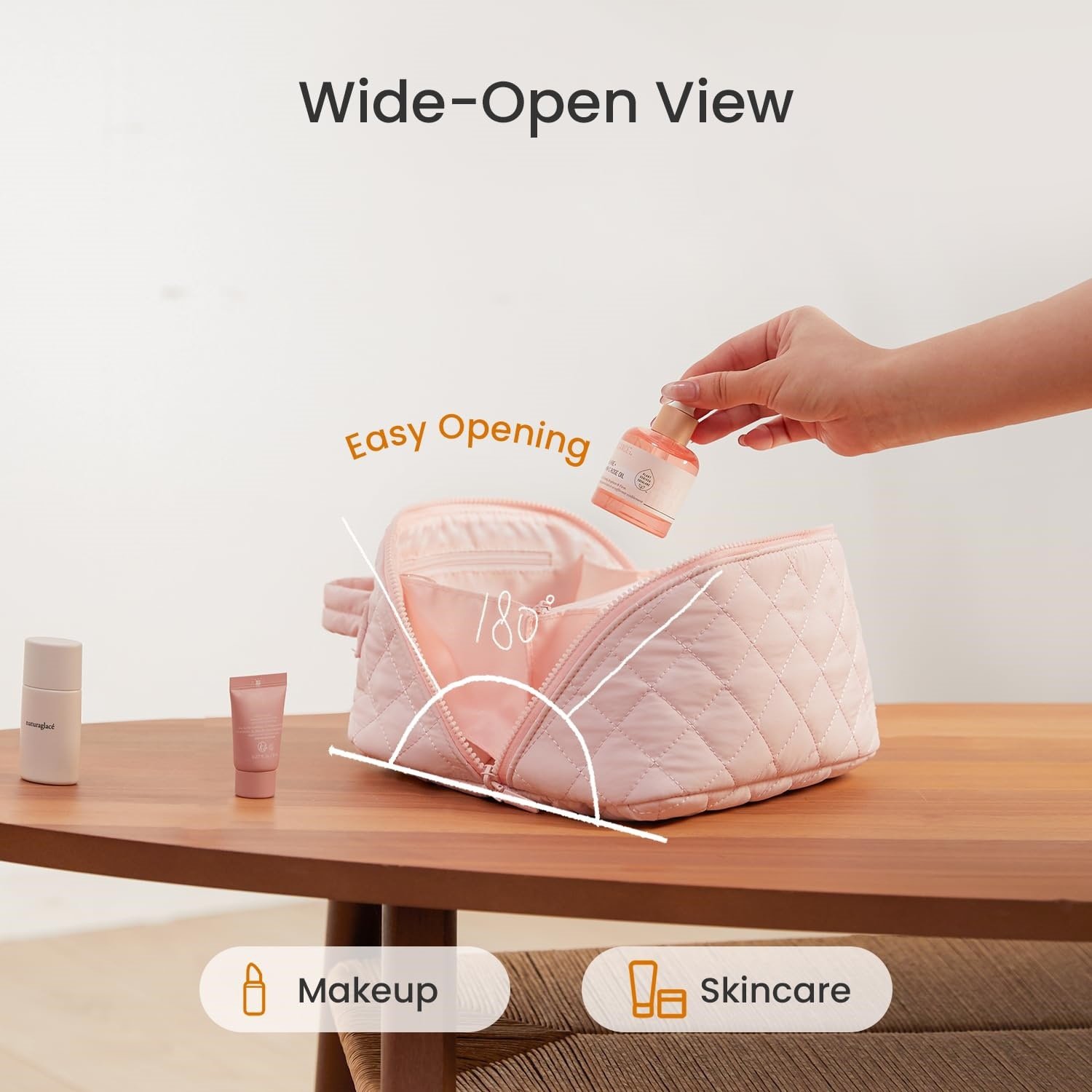 180° Lay-Flat Design: spacious large puffy makeup bag for women opens fully to a 180° lay-flat design, featuring 5 dedicated compartments to store all makeup and skincare essentials. The wide-open view allows quick access to brushes, toners, eyeshadow palettes, and full-size skincare bottles, keeping your makeup organizer clutter-free.